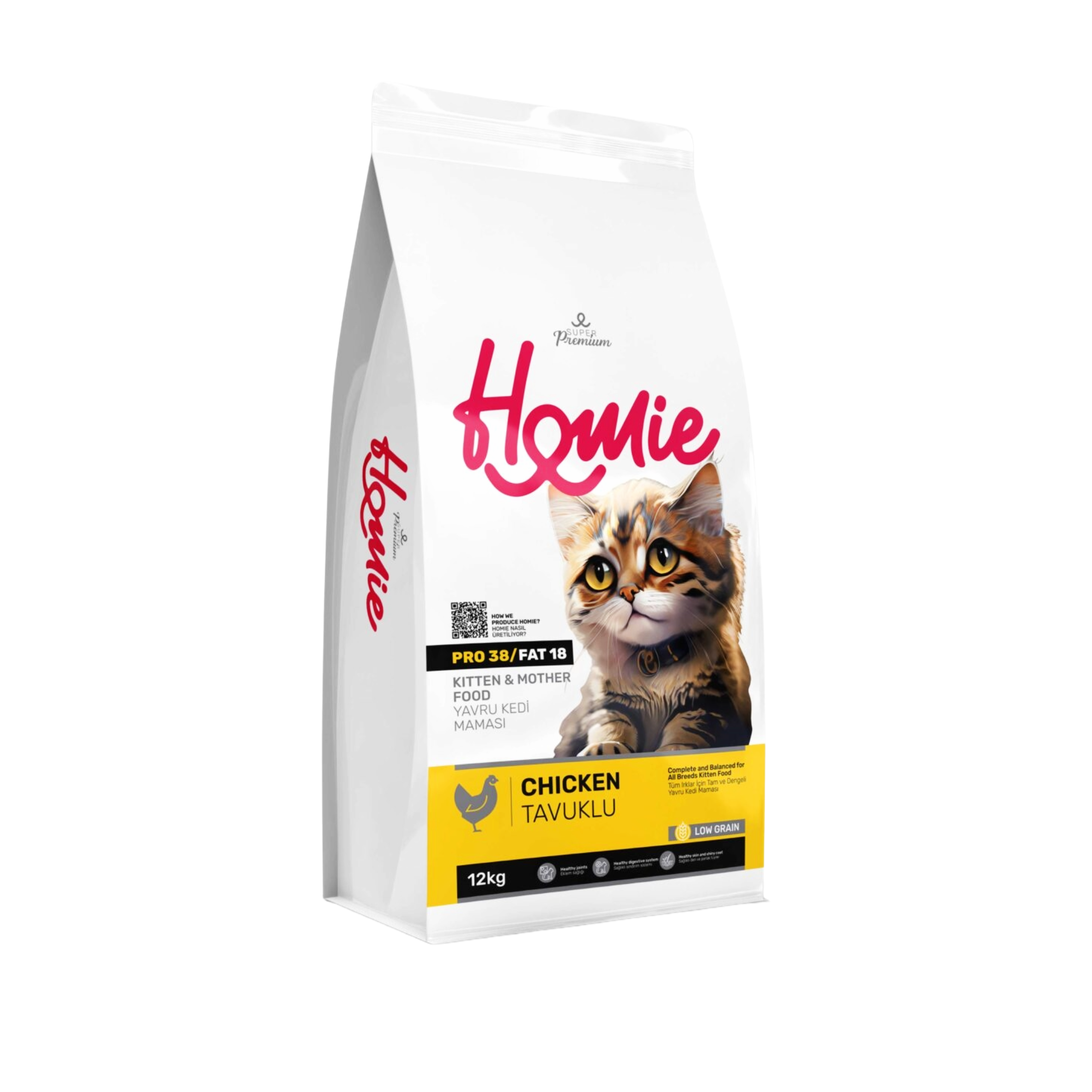 Homie Low Grain Chicken Kitten and Mother Cat Food is a super-premium formula designed to meet the specialized nutritional needs of growing kittens and nursing mother cats. With a remarkable 44% processed chicken protein and 38% crude protein, this formula ensures rapid development, energy, and muscle growth.